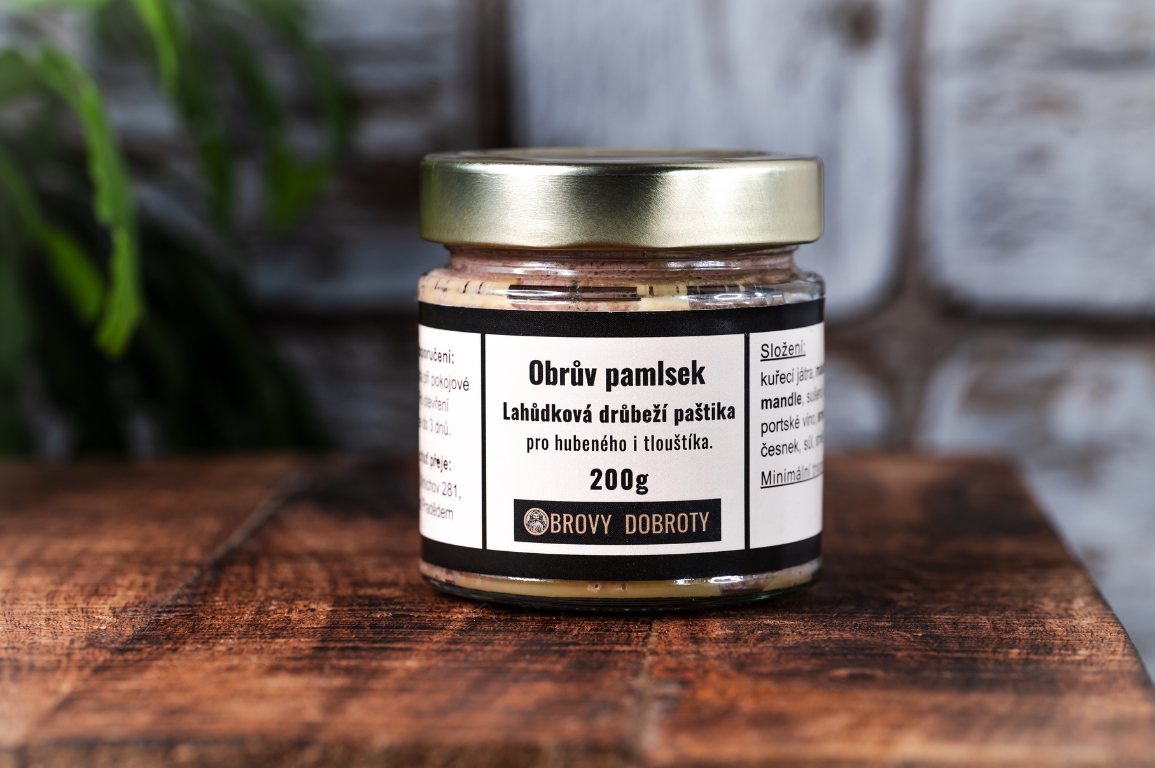 Obrův pamlsek je jemná drůbeží paštika s vysokým podílem másla a jemnou cibulkou opečenou na sádle. Vyladěná pečeným česnekem a portským vínem (Oporto Royal). Na závěr dochucená tajnou, dokonale vyváženou směsí koření s přidanými kousky mandlí a sušených jablek. Skvělá na sváteční posezení s celou rodinou, s čerstvým, křupavým bílým pečivem, kousky sladkého ovoce (mango, kaki, hroznové víno) a čerstvým lístkem šalvěje je nepřekonatelnou pochoutkou, po které se jen zapráší.